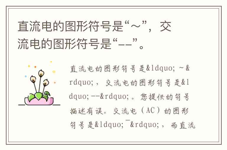 您提供的符号描述有误。交流电(AC)的图形符号是“~”,而直流电(DC)的图形符号是“—”。这种符号体系源于电流特性:交流电因方向和大小随时间周期性变化(如家用220V50Hz电源),用波浪线“”直观表示其正弦波形;直流电则因方向恒定(如电池供电),用直线“—”象征电流的单向流动特性。