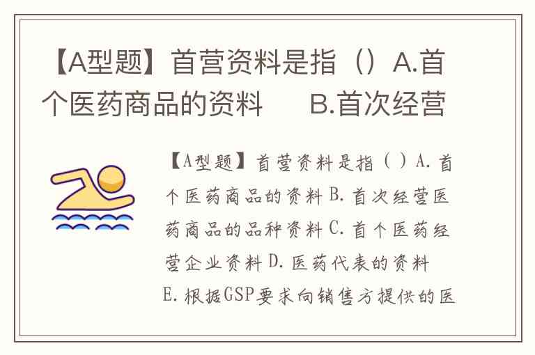 【A型题】首营资料是指()A.首个医药商品的资料 B.首次经营医药商品的品种资料 C.首个医药经营企业资料 D.医药代表的资料 E.根据GSP要求向销售方提供的医药商品的资料,一般包括企业资质资料和产品资料