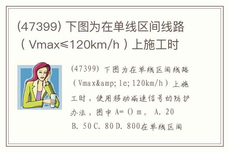 (47399) 下图为在单线区间线路 ( Vmax≤120km/h ) 上施工时 , 使用移动减速信号的防护办法 , 图中 A= () m 。 A. 20 B. 50 C. 80 D. 800