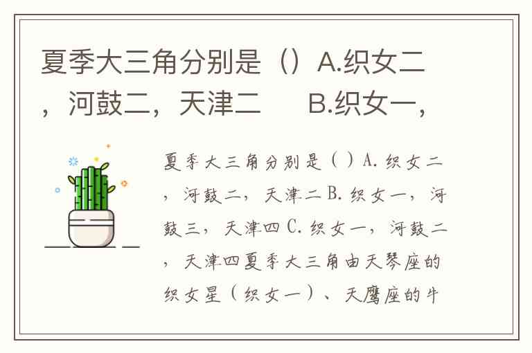 夏季大三角分别是()A.织女二,河鼓二,天津二 B.织女一,河鼓三,天津四 C.织女一,河鼓二,天津四