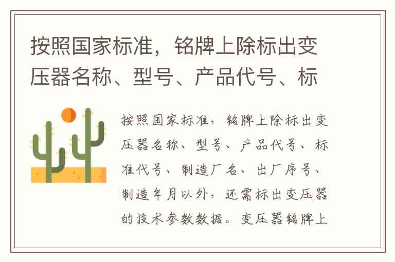 按照国家标准,铭牌上除标出变压器名称、型号、产品代号、标准代号、制造厂名、出厂序号、制造年月以外,还需标出变压器的技术参数数据。
