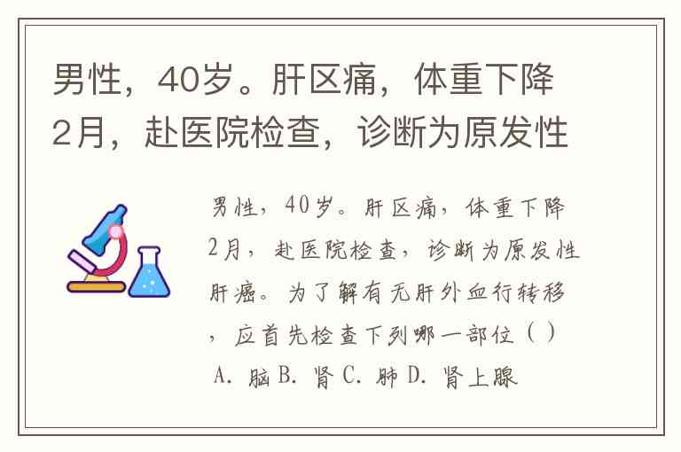 男性,40岁。肝区痛,体重下降2月,赴医院检查,诊断为原发性肝癌。为了解有无肝外血行转移,应首先检查下列哪一部位() A. 脑 B. 肾 C. 肺 D. 肾上腺 E. 骨骼