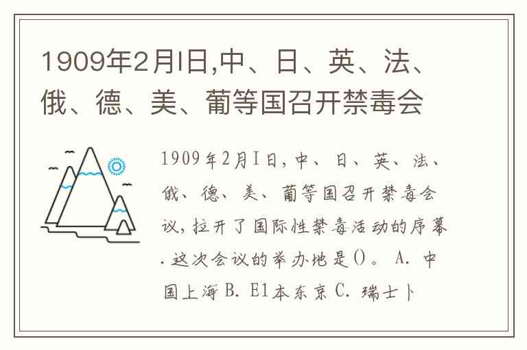 1909年2月I日,中、日、英、法、俄、德、美、葡等国召开禁毒会议,拉开了国际性禁毒活动的序幕.这次会议的举办地是()。 A. 中国上海 B. E1本东京 C. 瑞士卜1内瓦