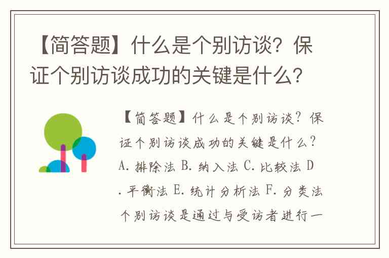 【简答题】什么是个别访谈?保证个别访谈成功的关键是什么?A.排除法 B.纳入法 C.比较法 D.平衡法 E.统计分析法 F.分类法