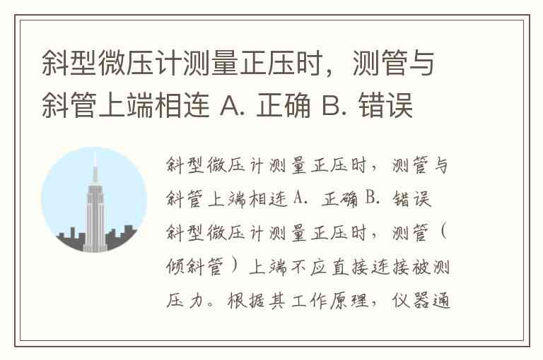 这一设计基于液体静力学原理:正压作用于宽广容器液面,迫使液体沿倾斜管上升,利用倾斜角度放大微小压力变化。若误将正压接至倾斜管上端,会导致测量原理失效,无法准确读取压力值。因此,题目描述的连接方式错误。