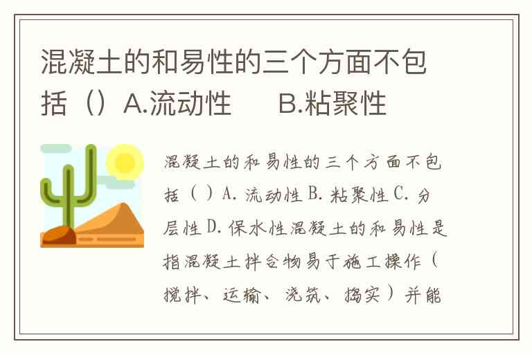 混凝土的和易性的三个方面不包括()A.流动性 B.粘聚性 C.分层性 D.保水性
