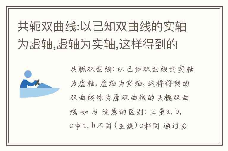 共轭双曲线是解析几何中具有特殊位置关系的一对双曲线,其本质是实轴与虚轴互换的产物。对于标准方程为 \(\frac{x^2}{a^2} - \frac{y^2}{b^2} = 1\) 的双曲线,其共轭双曲线方程为 \(-\frac{x^2}{a^2} + \frac{y^2}{b^2} = 1\)(即 \(\frac{y^2}{b^2} - \frac{x^2}{a^2} = 1\)),两者通过交换方程中的正负号直接生成,因此互为共轭。这种变换导致它们的几何特征呈现出既对称又关联的独特性质。