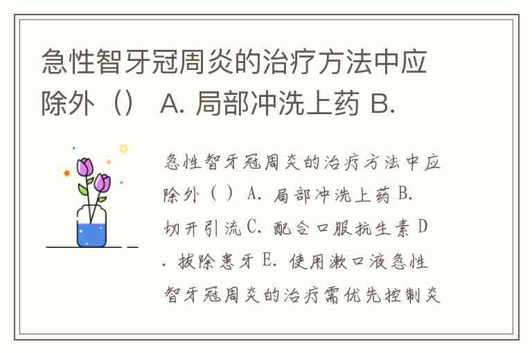 急性智牙冠周炎的治疗需优先控制炎症而非立即拔除患牙,因此 D. 拔除患牙 应作为除外选项。这一结论基于传统医学共识与近年临床研究的综合考量:早期观点认为急性期拔牙可能导致感染扩散,主张先通过局部冲洗(如双氧水+生理盐水交替冲洗盲袋)、切开引流(适用于形成脓肿时)、口服抗生素(如阿莫西林联合甲硝唑)及含漱液(如复方硼砂溶液)等保守治疗控制炎症。尽管部分研究显示,在严格掌握适应证(如炎症局限、无全身感染、张口度基本正常)的前提下,急性期拔牙可缩短疗程,但这属于特殊情况且需谨慎评估,并非常规治疗手段。