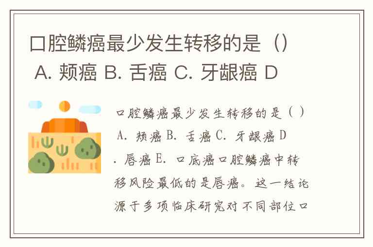 口腔鳞癌最少发生转移的是() A. 颊癌 B. 舌癌 C. 牙龈癌 D. 唇癌 E. 口底癌
