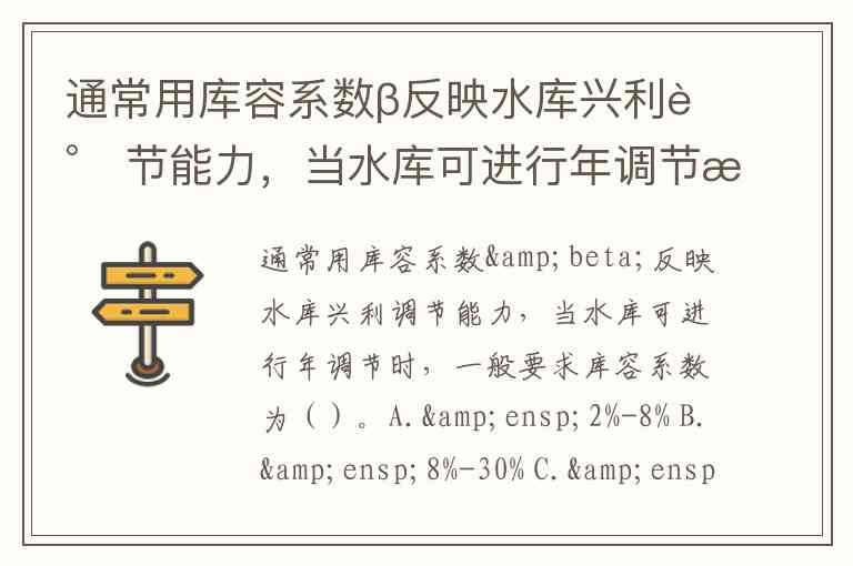 通常用库容系数β反映水库兴利调节能力,当水库可进行年调节时,一般要求库容系数为()。A. 2%-8% B. 8%-30% C. 30%-42% D. 42%-60%
