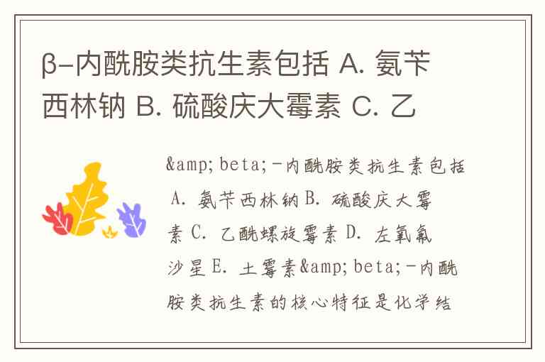 β-内酰胺类抗生素的核心特征是化学结构中含有β-内酰胺环,这类药物包括青霉素类、头孢菌素类、非典型β-内酰胺类及β-内酰胺酶抑制剂等亚类。题目选项中,氨苄西林钠属于广谱青霉素类,是半合成青霉素的典型代表,其分子结构中明确包含β-内酰胺环,因此属于β-内酰胺类抗生素。