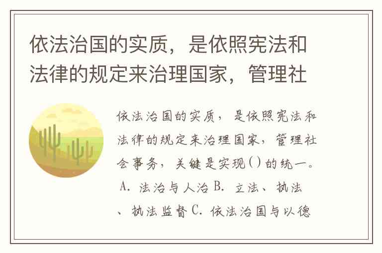 依法治国的实质,是依照宪法和法律的规定来治理国家,管理社会事务,关键是实现( )的统一。 A. 法治与人治 B. 立法、执法、执法监督 C. 依法治国与以德治国 D. 坚持党的领导、发扬人民民主和严格依法办事