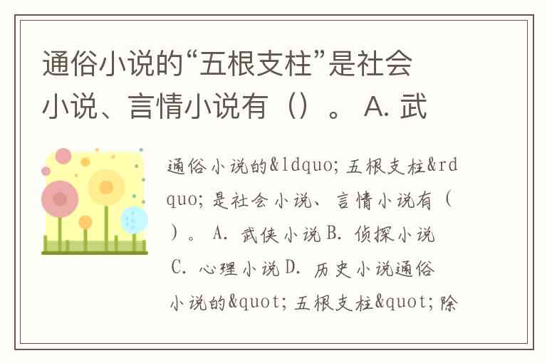 通俗小说的“五根支柱”是社会小说、言情小说有()。 A. 武侠小说 B. 侦探小说 C. 心理小说 D. 历史小说