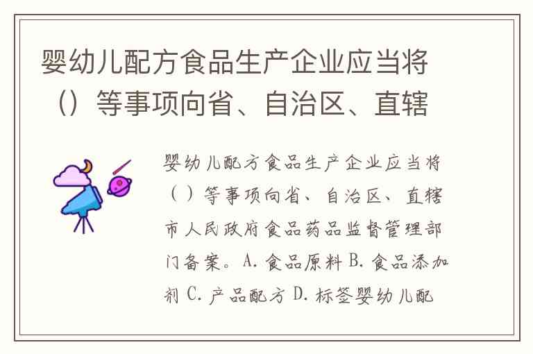 婴幼儿配方食品生产企业应当将()等事项向省、自治区、直辖市人民政府食品药品监督管理部门备案。A.食品原料 B.食品添加剂 C.产品配方 D.标签