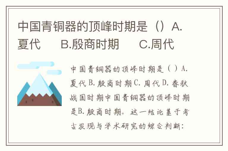 中国青铜器的顶峰时期是()A.夏代 B.殷商时期 C.周代 D.春秋战国时期