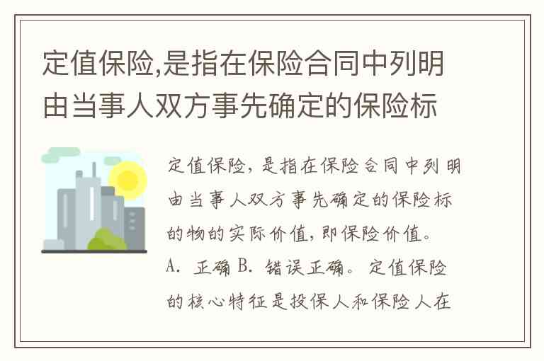 定值保险,是指在保险合同中列明由当事人双方事先确定的保险标的物的实际价值,即保险价值。 A. 正确 B. 错误