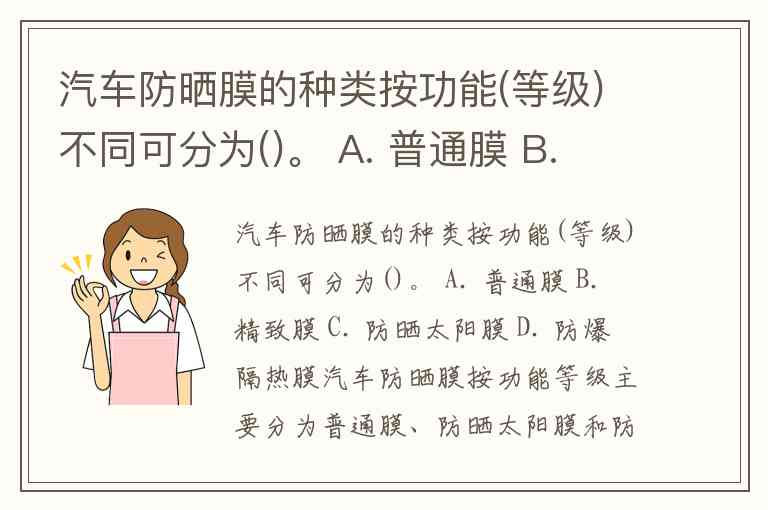 汽车防晒膜的种类按功能(等级)不同可分为()。 A. 普通膜 B. 精致膜 C. 防晒太阳膜 D. 防爆隔热膜