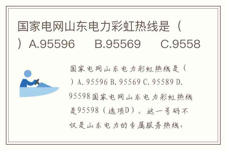 国家电网山东电力彩虹热线是95598(选项D)。这一号码不仅是山东电力的专属服务热线,更是全国统一的供电服务热线,24小时为用户提供用电业务咨询、电量电费查询、停电信息通知、故障报修、投诉举报等全方位服务。