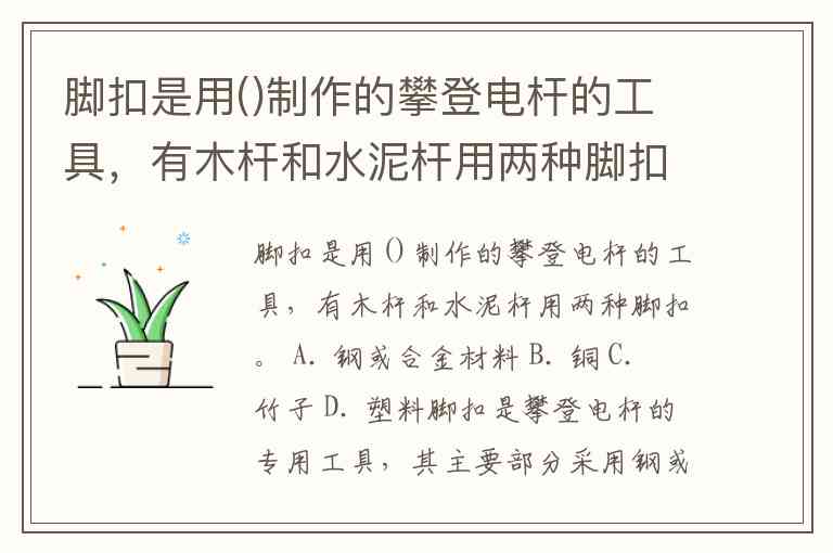 脚扣是用()制作的攀登电杆的工具,有木杆和水泥杆用两种脚扣。 A. 钢或合金材料 B. 铜 C. 竹子 D. 塑料