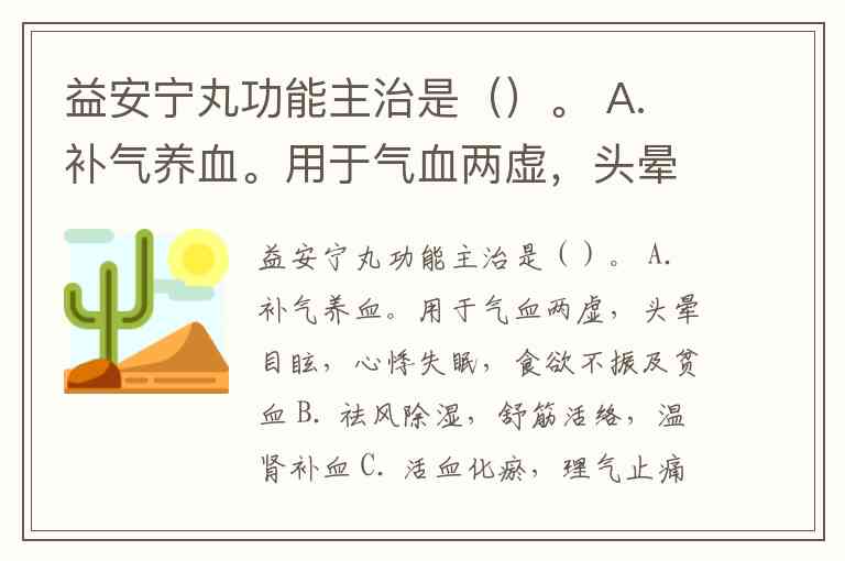 益安宁丸功能主治是()。 A. 补气养血。用于气血两虚,头晕目眩,心悸失眠,食欲不振及贫血 B. 祛风除湿,舒筋活络,温肾补血 C. 活血化瘀,理气止痛 D. 补气活血,益肝健肾,养心安神