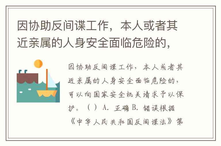 因协助反间谍工作,本人或者其近亲属的人身安全面临危险的,可以向国家安全机关请求予以保护。() A. 正确 B. 错误