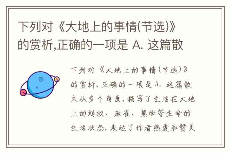 下列对《大地上的事情(节选)》的赏析,正确的一项是 A. 这篇散文从多个角度,描写了生活在大地上的蚂蚁、麻雀、熊蜂等生命的生活状态,表达了作者热爱和赞美这些勤劳勇敢、努力生活的精灵们的写作主旨。 B. 全文选用材料看似散漫,但作者通过一条感情的线索把它们贯穿组合起来,从而集中地揭示了“世界上的事物在速度上,衰落胜于崛起”这一主题。 C. 文章在描写不畏雷雨而为儿女衔食的麻雀时,赞美说:“它的姿势和蜂鸟在花丛前一样美丽。”这是因为鸟的羽毛不会被雨水淋湿而失去美丽的光泽。 D. 冬去春来,面对旷野,作者说“我有一种庄稼满地的幻觉”“想拿起锄头拼命劳动一场”。这样写,既表现了作者对劳动的渴望,又表达了对读者的呼唤。