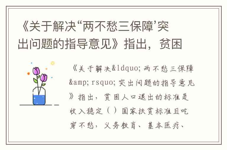 《关于解决“两不愁三保障”突出问题的指导意见》明确贫困人口退出需满足“收入稳定超过国家扶贫标准”,这一标准被各地政策文件称为“一达标”,是脱贫的核心指标之一。例如贵州省明确规定,贫困户退出需以户为单位,年人均可支配收入稳定超过当年国家公布的扶贫标准线,2019年这一标准为3747元,2020年为3972元。全国层面,现行扶贫标准为农村居民家庭年人均纯收入4000元,这一标准既包含了“不愁吃、不愁穿”的基本生活需求,也为“义务教育、基本医疗、住房安全”三项保障提供了经济基础。