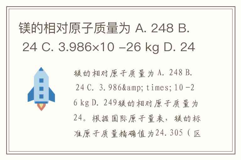 选项中,A(248)、D(249)数值远超实际范围,C(3.986×10⁻²⁶ kg)为镁原子的实际质量(单位kg),而非相对原子质量。相对原子质量是无量纲量,以碳-12原子质量的1/12为标准,因此正确答案只能是B选项24。这种简化既符合中学化学计算惯例,也与镁同位素的丰度特征相符——其主要同位素镁-24的质量数恰好为24。