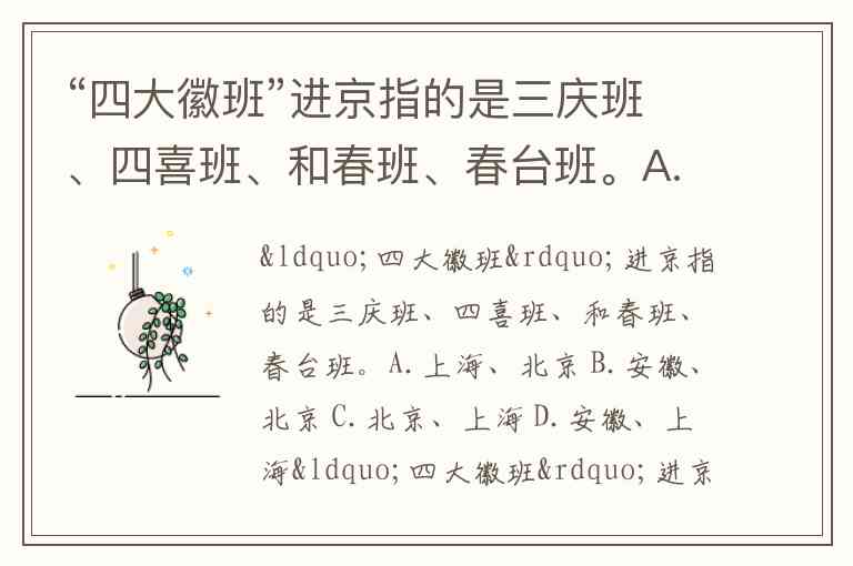 “四大徽班”进京指的是三庆班、四喜班、和春班、春台班。A.上海、北京 B.安徽、北京 C.北京、上海 D.安徽、上海