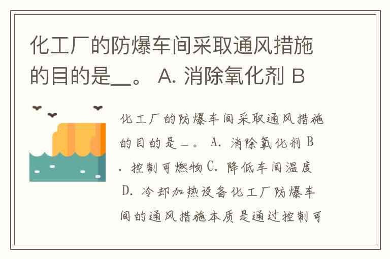 化工厂的防爆车间采取通风措施的目的是_。 A. 消除氧化剂 B. 控制可燃物 C. 降低车间温度 D. 冷却加热设备