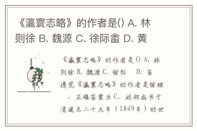 《瀛寰志略》的作者是徐继畬,正确答案为 C。这部成书于清道光二十九年(1849年)的世界地理著作,与魏源的《海国图志》并列为中国近代早期系统介绍世界的重要典籍。作为晚清名臣与地理学家,徐继畬在书中以10卷14.5万字的篇幅,辅以42张插图,详细记载了全球各国的地理、历史与风土人情,被《纽约时报》赞誉为“东方伽利略”。