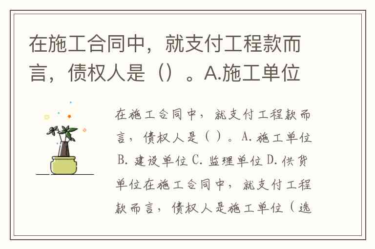 在施工合同中,就支付工程款而言,债权人是()。A.施工单位 B.建设单位 C.监理单位 D.供货单位