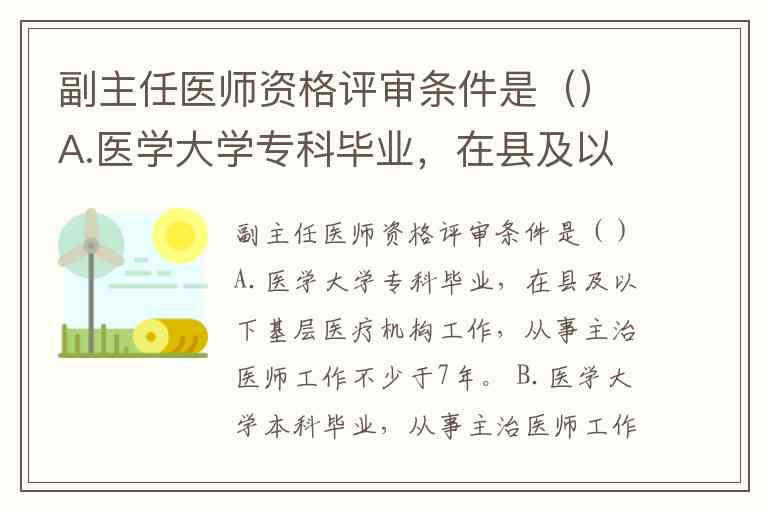 副主任医师资格评审条件是()A.医学大学专科毕业,在县及以下基层医疗机构工作,从事主治医师工作不少于7年。 B.医学大学本科毕业,从事主治医师工作不少于5年。 C.取得临床医学硕士学位,从事主治医师工作不少于4年。 D.取得临床医学博士学位,从事主治医师工作不少于2年。