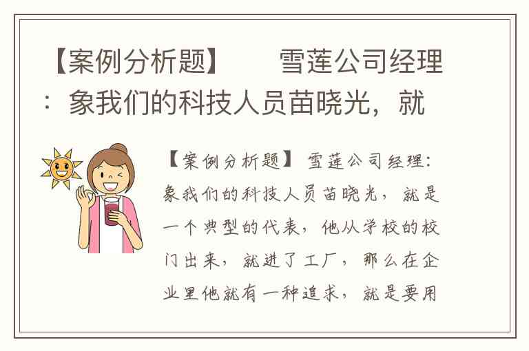 【案例分析题】 雪莲公司经理:象我们的科技人员苗晓光,就是一个典型的代表,他从学校的校门出来,就进了工厂,那么在企业里他就有一种追求,就是要用他在学校里面的所学,结合生产的需要,结合因为中国是个羊绒的大国,不仅仅是资源大国,也是一个生产大国,如何要把自己的所学,结合实践要发明创造出最好的分梳技术,这样一种抱负,这样一种追求,激励他将近6年的时间内,在研制小组的领导下,发挥了他自己的特长,终于在95年,我们取得了突破性的进展,获得了专家鉴定,就是这项工艺BSLD—95的工艺技术,获得九十年代国际先进水平的这样一个评价。 苗晓光:作为一名知识分子,在企业里想干一些事,象我们这样一些从学校毕业以后到基层工作的人,对自己来讲人一辈子要能干出点贡献。反正我是这么想的,其实事上也是这样,因为一个人要想干成一件事,没有企业领导的支持,没有周围人创造的环境条件,要干成点事也很难,象我们这个项目就是这样的,所以历时有6年。在刚开始研制的时候,因为我们厂处于低谷的特殊情况,一个是人们也不理解,因为消耗资金比较大,再一个是人力、物力的条件都不特别具备。这样情况下,李总来了(因为他是技术出身),当他了解到这个情况,又了解了分梳的重要性以后,决定把这个项目干下去。回想这个项目的完成,对我自己来讲觉得这本身也是做了一件有意义的事情。虽然不是什么大事,但也算是为企业做了一点贡献,今后的路还很长,我想这还只是走完了第一步,今后还有推广和有一个更好地应用和发展的过程,事物是没有止境的,我想在领导的支持下一定会做得更好。 苗晓光:这就是公司奖励给我的一套住房,是公司最好的住房了,对我来说是非常知足的。因为什么呢?在这个项目搞好之前,公司曾两次给我调整住房,从原来我住房子的八平方米到16平方米,后来又给了一套两居室。后来公司认为贡献(与报酬)应该是相对应的,所以就奖给了我这套住房,建筑面积大约有90多平方米。对我自己来说,心里感到一种踏实、一种充满。在北京有套住房是比较难的,给套住房也是对我工作的一种承认。你看这里面房子的格局都是好的,不仅是在住房上领导给了奖励,而且在工作的其他方面,如:晋级、职称,还有工资待遇上也给了相应的奖励,我想我不能辜负领导对我的奖励,对自己来说也不能辜负一个知识分子在工作上应该更努力的工作,主要是为企业做出新的贡献。 请用麦克利兰的成就激励理论来分析小苗的成长过程。