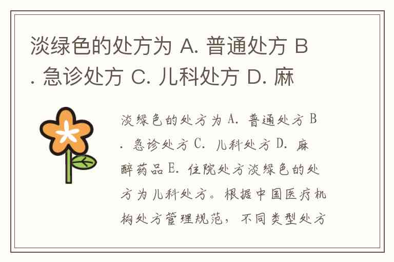淡绿色的处方为 A. 普通处方 B. 急诊处方 C. 儿科处方 D. 麻醉药品 E. 住院处方
