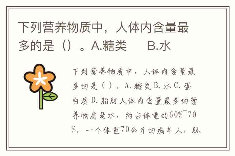 下列营养物质中,人体内含量最多的是()。A.糖类 B.水 C.蛋白质 D.脂肪