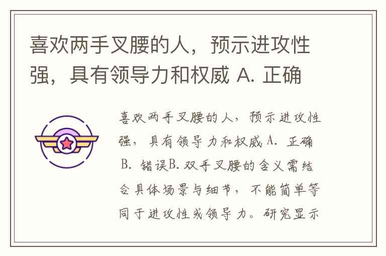 喜欢两手叉腰的人,预示进攻性强,具有领导力和权威 A. 正确 B. 错误