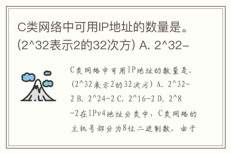 C类网络中可用IP地址的数量是。(2^32表示2的32次方) A. 2^32-2 B. 2^24-2 C. 2^16-2 D. 2^8-2