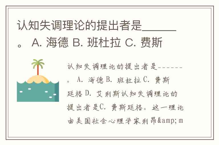 认知失调理论的提出者是______。 A. 海德 B. 班杜拉 C. 费斯廷格 D. 艾利斯