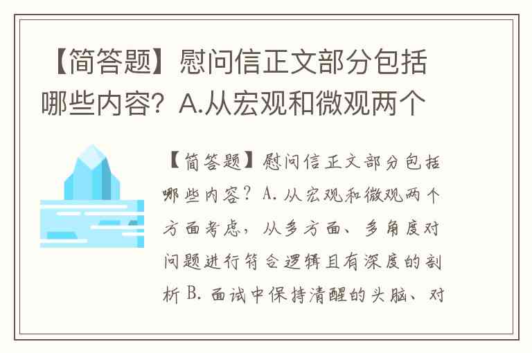 【简答题】慰问信正文部分包括哪些内容?A.从宏观和微观两个方面考虑,从多方面、多角度对问题进行符合逻辑且有深度的剖析 B.面试中保持清醒的头脑、对事物分轻重缓急,把握重点 C.发言过程中努力做到思路清晰,层次分明,详略得当,分条概括 D.保持真诚自信、谦虚认真的精神状态