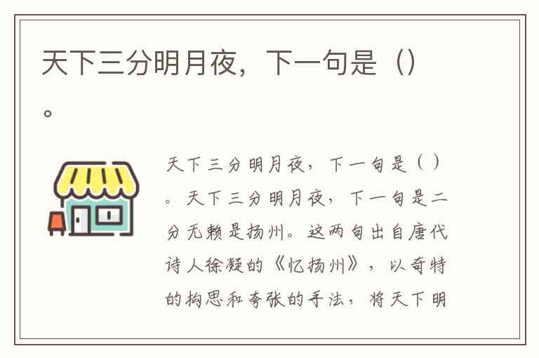 天下三分明月夜,下一句是二分无赖是扬州。这两句出自唐代诗人徐凝的《忆扬州》,以奇特的构思和夸张的手法,将天下明月的光华分为三份,其中“无赖”的扬州竟独占其二,既表达了对扬州美景的极致赞美,也暗含着对这座城市难以排遣的思念。诗人用“无赖”一词反话正说,看似嗔怪扬州的“不依不饶”,实则凸显了它在诗人心中占据的分量,成为描写扬州的千古名句。