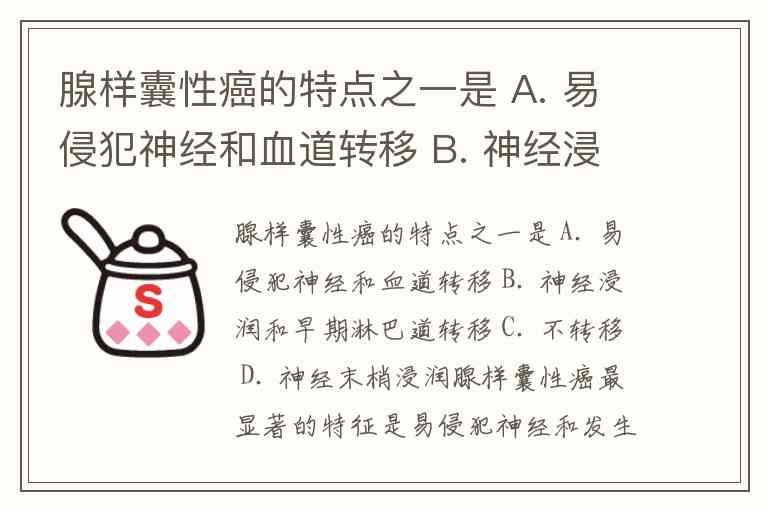 腺样囊性癌的特点之一是 A. 易侵犯神经和血道转移 B. 神经浸润和早期淋巴道转移 C. 不转移 D. 神经末梢浸润