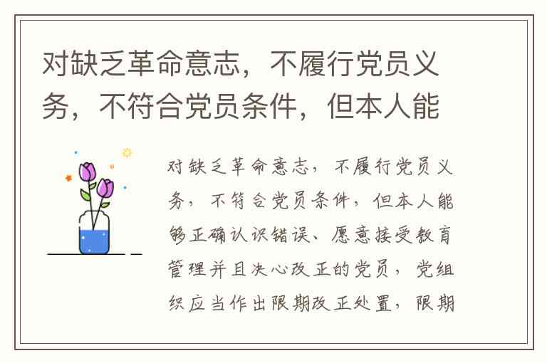 对于缺乏革命意志、不履行党员义务且不符合党员条件,但本人能够正确认识错误、愿意接受教育管理并决心改正的党员,党组织应作出限期改正处置,限期改正时间不超过1年。这一规定在《中国共产党党员教育管理工作条例》中有明确表述,既体现了党组织对党员的严格要求,也给予了党员自我改进的机会。