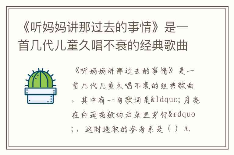 《听妈妈讲那过去的事情》是一首几代儿童久唱不衰的经典歌曲,其中有一句歌词是“月亮在白莲花般的云朵里穿行”,这时选取的参考系是() A. 云 B. 月亮 C. 地面 D. 星