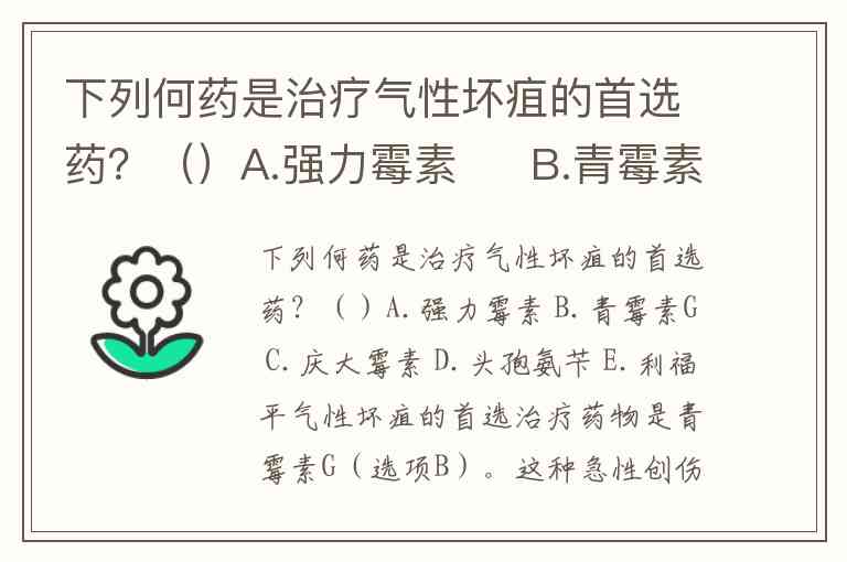 下列何药是治疗气性坏疽的首选药?()A.强力霉素 B.青霉素G C.庆大霉素 D.头孢氨苄 E.利福平