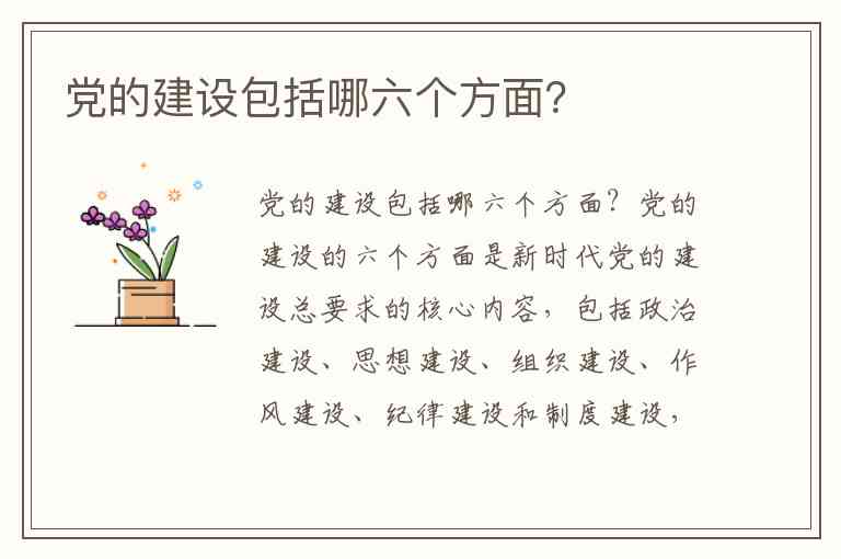 党的建设的六个方面是新时代党的建设总要求的核心内容,包括政治建设、思想建设、组织建设、作风建设、纪律建设和制度建设,这一体系形成于党的十九大对党建布局的重大调整,体现了全面从严治党向纵深发展的理论创新。其中,政治建设被确立为党的根本性建设,决定着党的建设方向和效果,其核心是确保全党在政治立场、政治方向、政治原则、政治道路上同党中央保持高度一致,通过制定正确的纲领路线和方针政策统一思想行动。