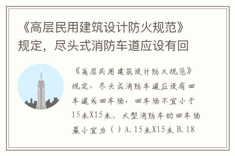 《高层民用建筑设计防火规范》规定,尽头式消防车道应设有回车道或回车场,回车场不宜小于15米X15米。大型消防车的回车场最小宜为()A.15米X15米 B.18米X18米 C.20米X20米 D.25米X25米