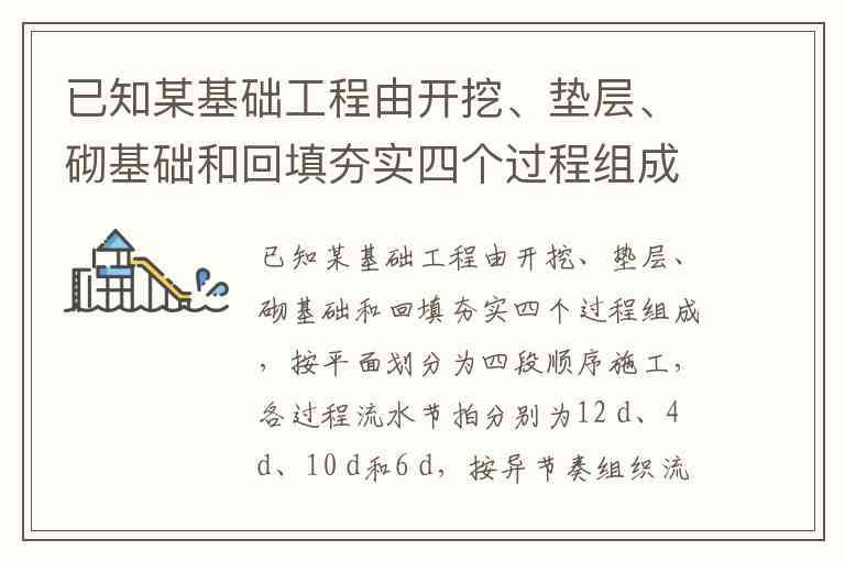 已知某基础工程由开挖、垫层、砌基础和回填夯实四个过程组成,按平面划分为四段顺序施工,各过程流水节拍分别为12 d、4 d、10 d和6 d,按异节奏组织流水施工的工期则为 ( )。 A. 38 d B. 40 d C. 56 d D. 128 d