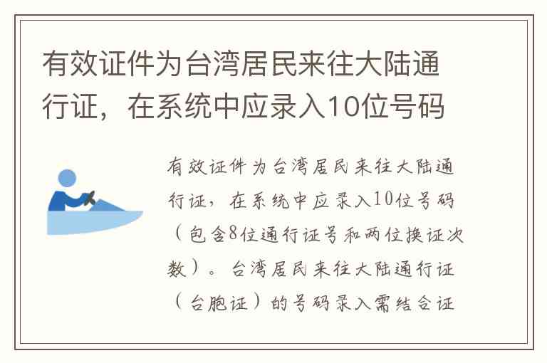有效证件为台湾居民来往大陆通行证,在系统中应录入10位号码(包含8位通行证号和两位换证次数)。