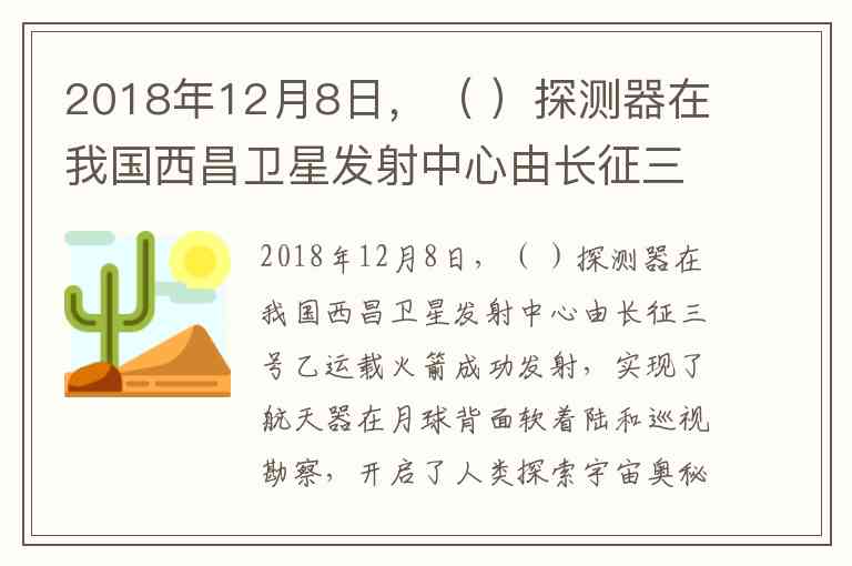 2018年12月8日,( )探测器在我国西昌卫星发射中心由长征三号乙运载火箭成功发射,实现了航天器在月球背面软着陆和巡视勘察,开启了人类探索宇宙奥秘的新篇章。 A. 玉兔四号 B. 四号 C. 嫦娥四号 D. 鹊桥四号